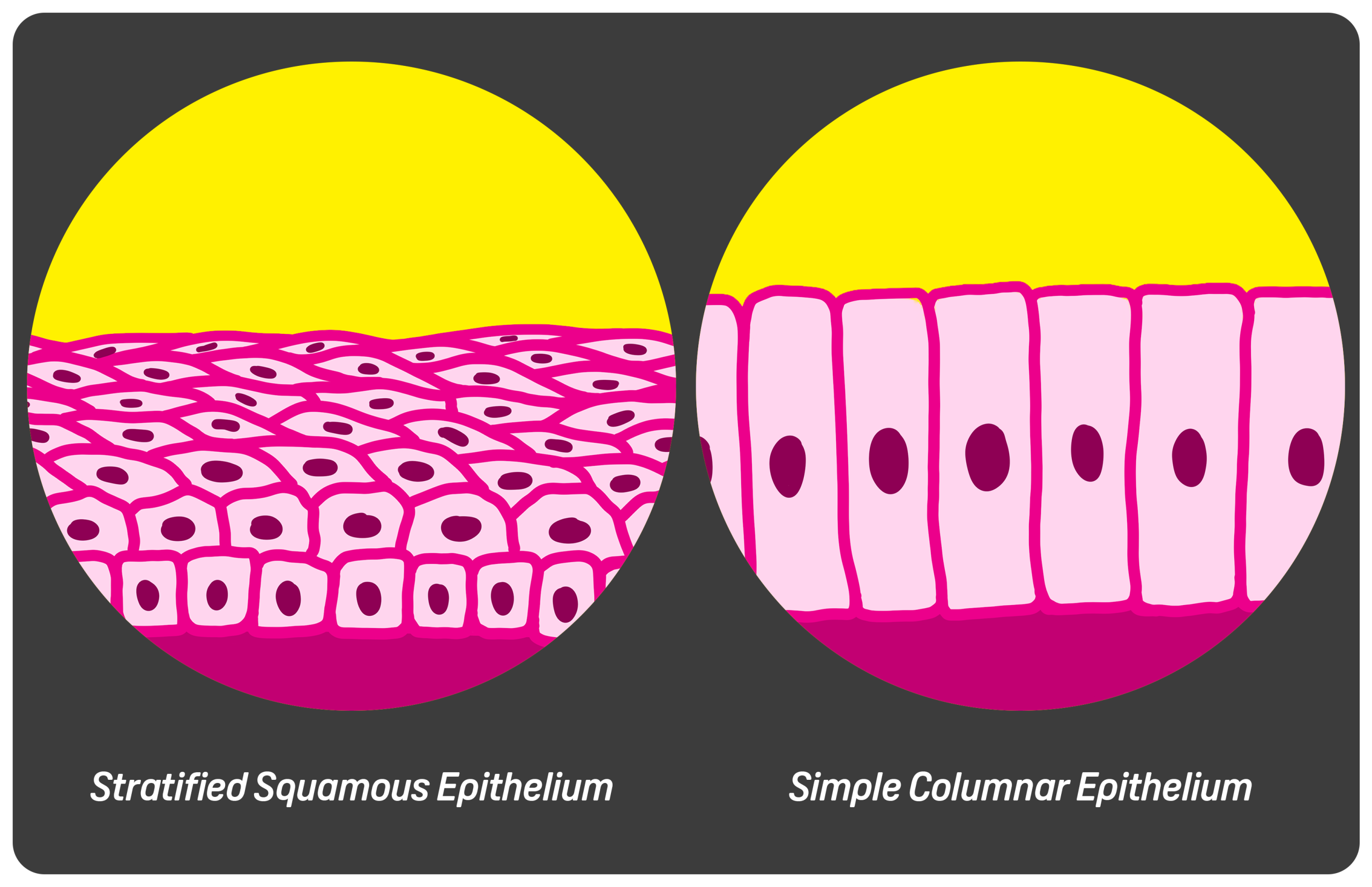 Further down the oesophagus near the GOJ, we have columnar cells. These cells don’t regenerate as quickly as the stratified squamous cells higher up because their purpose is not to endure mechanical stress. These cells are tall and rectangular and their purpose is to both secrete mucus for lubrication and for chemical resilience due to its close proximity to the stomach. In certain pathological states (such as Barrett’s Oesophagus), the squamous epithelium is replaced by metaplastic columnar epithelium. This change increases acid resistance but also raises cancer risk.