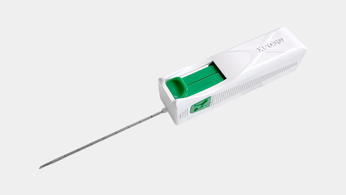 The MedOne is an automatic biopsy needle with a wingless charging design.